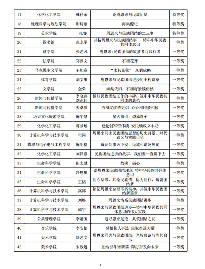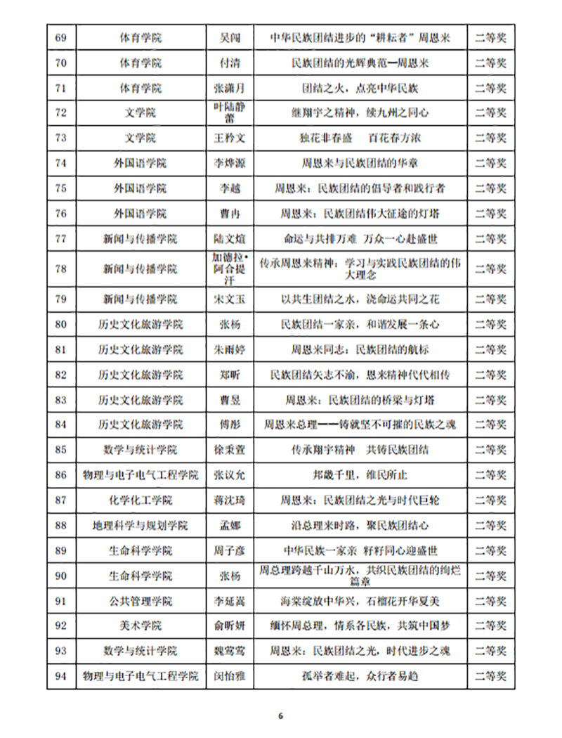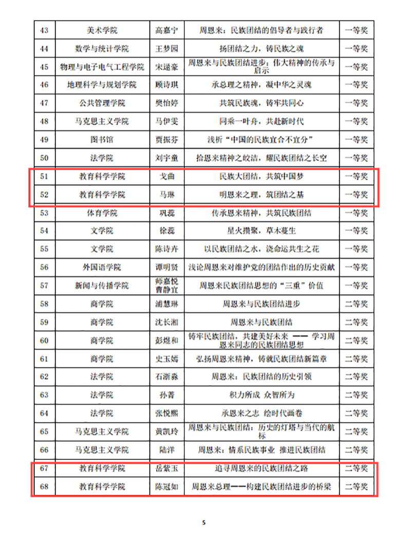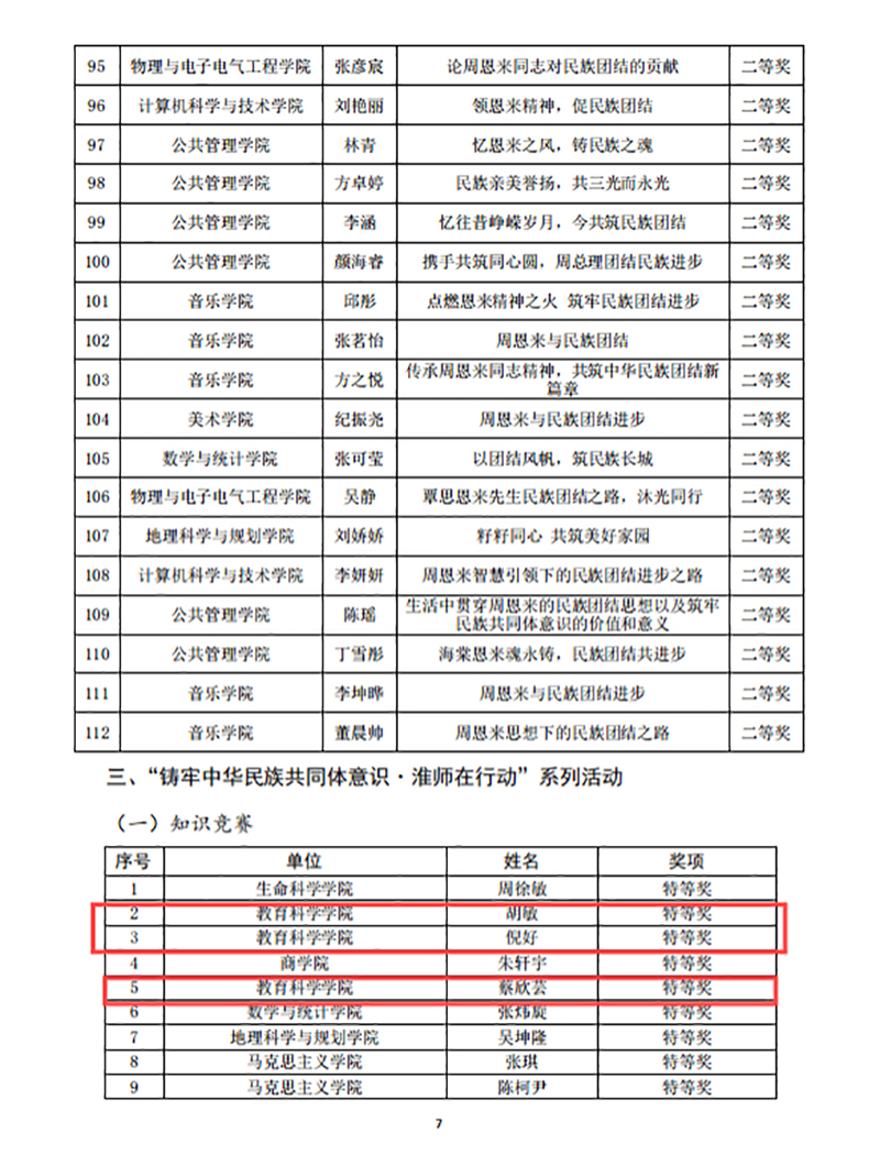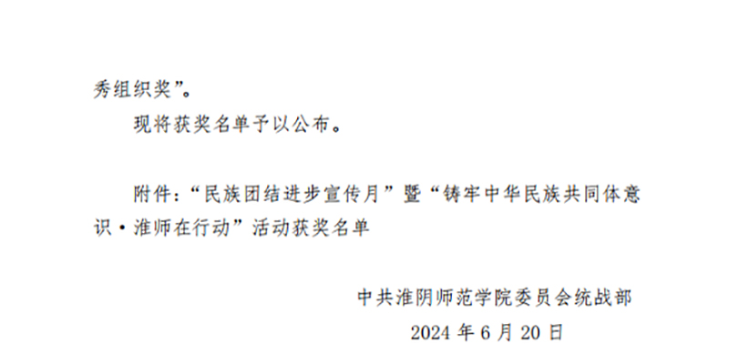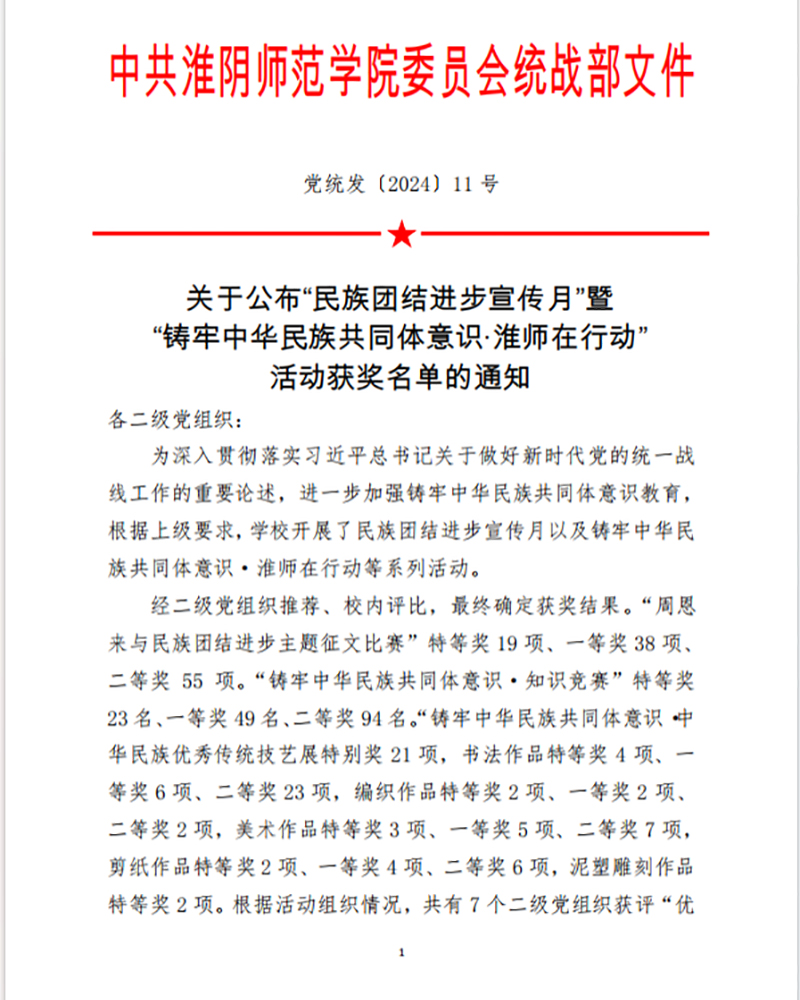 ky开云网页版app积极组织师生参加了“周恩来与民族团结进步主题征文比赛”“铸牢中华民族共同体意识·淮师在行动”知识竞赛及“铸牢中华民族共同体意识·中华民族优秀传统技艺展作品评比”等赛事,并取得了优异成绩。在征文比赛中,ky开云网页版app荣获特等奖一项、一等奖两项、二等奖两项;在知识竞赛中,ky开云网页版app获特等奖三项、一等奖三项、二等奖五项;在民族优秀传统技艺展作品评比中,ky开云网页版app的剪纸作品荣获特等奖两项、一等奖四项、二等奖五项。