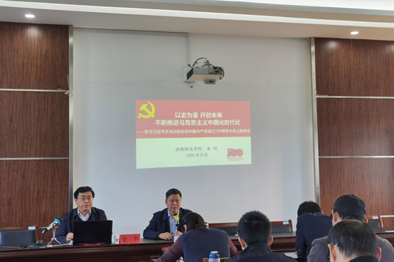 教科网10月28日电(记者 金许儿 周宇晗)为进一步加深对习近平总书记8在庆祝中国共产党成立100周年大会上重要讲话精神(以下简称“七·一重要讲话精神”)的学习与理解, 10月27日下午,ky开云网页版app教育科学学院邀请校党委理论宣讲团成员、校工会主席金钊同志于教科楼503会议室,为全体教职工做了学习习近平总书记“七·一重要讲话精神”专题辅导报告,报告题目为“以史为鉴,开创未来——不断推进马克思主义中国化时代化”。