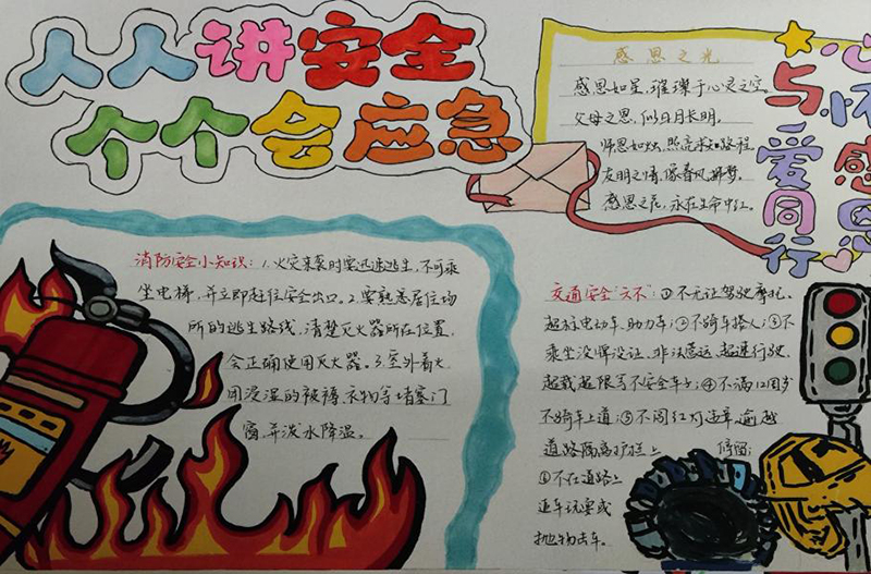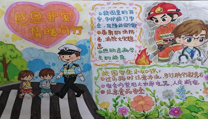本次活动围绕“感恩护安,情暖同行”主题,鼓励学生以手抄报为载体,表达对社区安保人员、消防队员等平凡岗位上默默奉献者的感激之情,同时展示安全知识与应急技能。同学们踊跃参与,创作出一批内容丰富、形式多样的作品,有的描绘消防员逆行救援的感人场景,有的图文并茂讲解灭火器使用方法,还有的以暖心文字致敬日夜值守的社区守护者。
