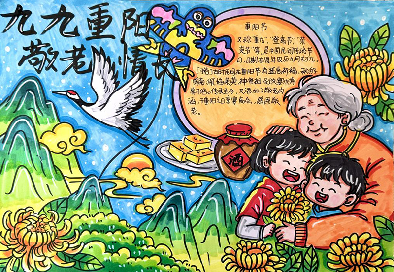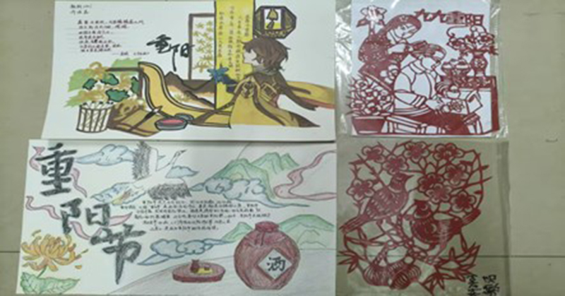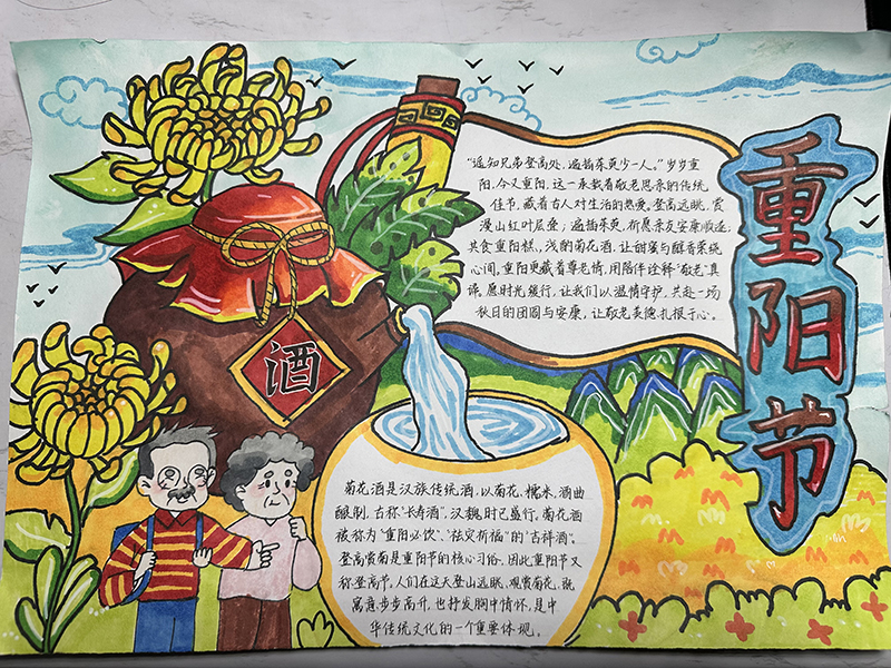 与此同时,“指尖传暖·重阳手作”创意工坊激发了同学们的创作热情。大家用手绘手抄报描绘登高赏菊的节日图景,用剪纸艺术呈现菊花、寿桃、登高人等重阳元素,将传统意象与现代审美巧妙结合。一幅幅作品色彩斑斓、构思新颖,不仅展现了同学们的巧思与才艺,更承载着对长辈的祝福与敬意。