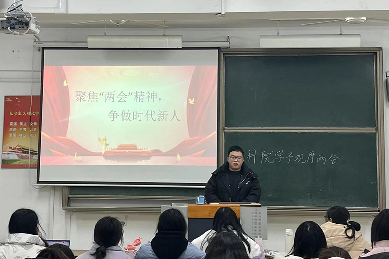 本次观摩活动主要包含“两会”解读,交流分享以及总结展望三个环节。活动伊始,沈天赐带领大家从“两会”概况出发,让大家了解“两会”开展流程等知识,并向大家介绍了今年“两会”的内容。在感悟分享环节,同学们从自身出发,结合“两会”内容展开热烈的讨论与交流。