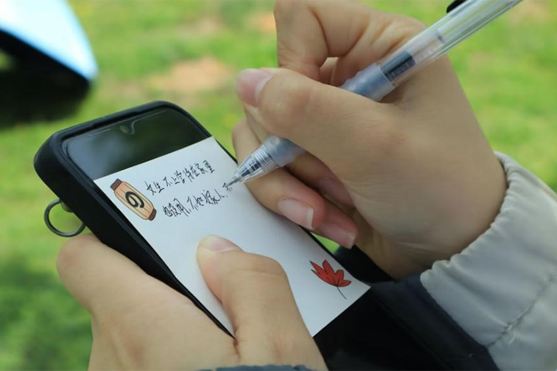最后,活动进入第三环节“言语之刃,筑盾愈心”。同学们先在准备好的纸条上写下曾听过的伤人的话,后借助同伴的力量,在蝴蝶贴纸上写下反驳、安慰的话语,一起筑起盾牌,守护心灵。