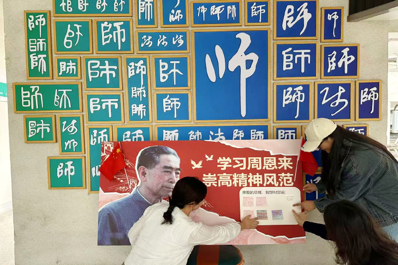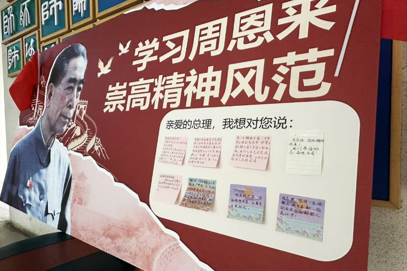 活动最后,同学手持小国旗,共同唱响《我和我的祖国》。悠扬的歌声中,同学们将写有自己国庆愿望和青春誓言的卡片贴在“学习周恩来崇高精神风范”主题板上。一张张卡片,既是对祖国的祝福,也是对传承总理精神的承诺。